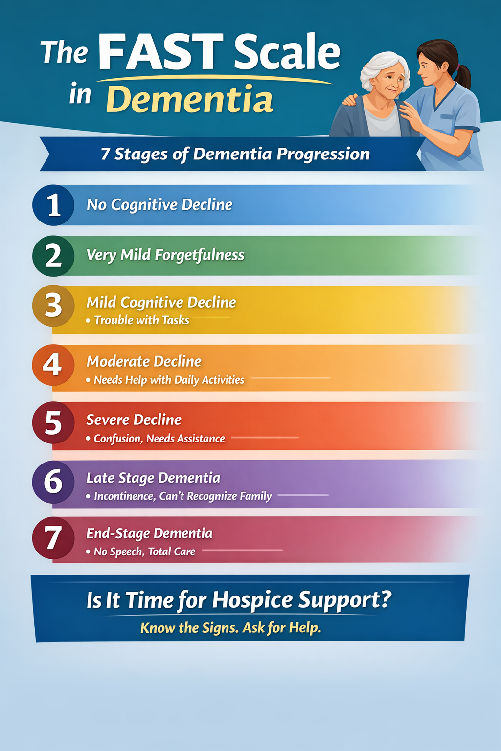 Unlike general “early, middle, late” descriptions, the FAST Scale breaks dementia into 7 stages, with sub-stages in the later phase.